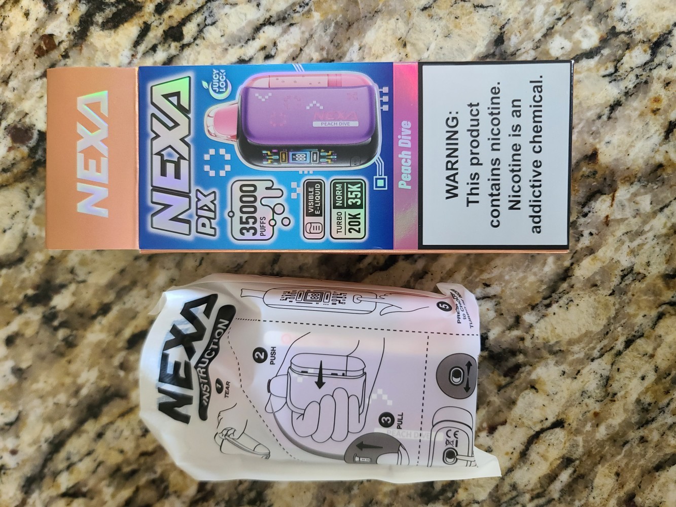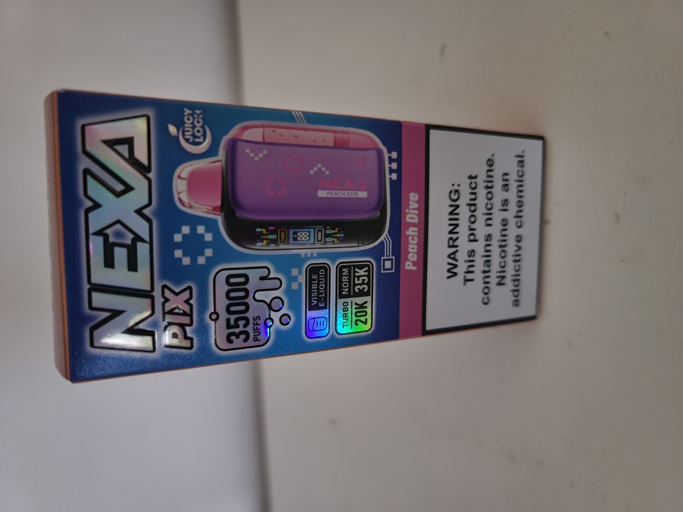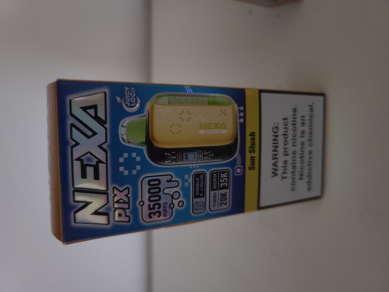The NEXA PIX 35K Disposable Vape maximizes flavor freshness with its Juicy Lock sealed e-liquid system. The integrated 800mAh battery supports extended use with convenient USB-C recharging.Its compact design fits in any pocket while having a clear HD screen that displays battery level and vaping mode. You can switch between Normal mode (35,000 puffs) and Turbo mode (20,000 puffs) to match your style. The Crystal Tank delivers visible e-liquid levels, minimized residue and extended vaping sessions.